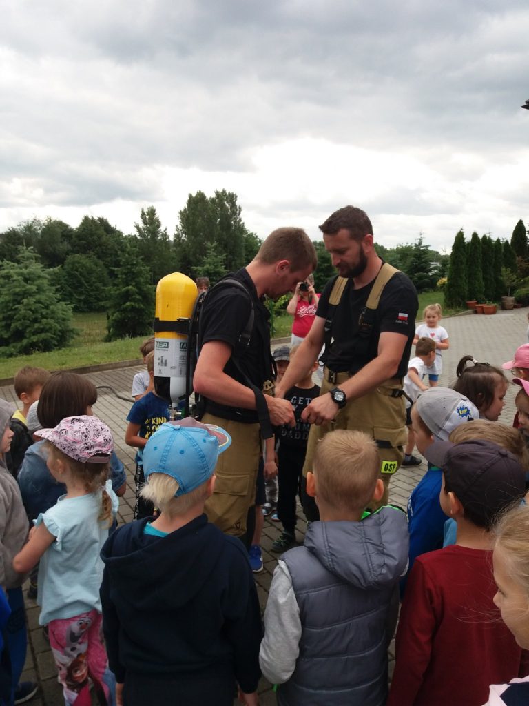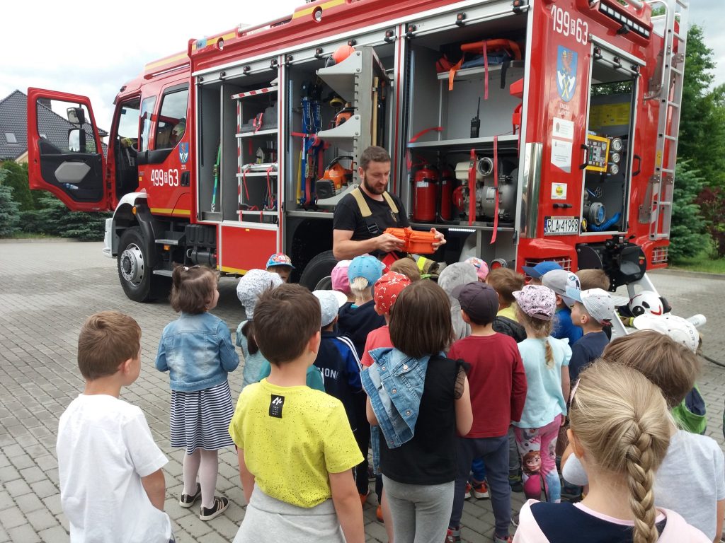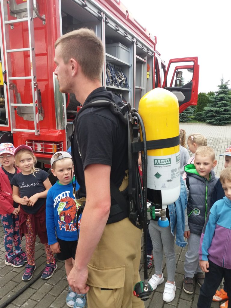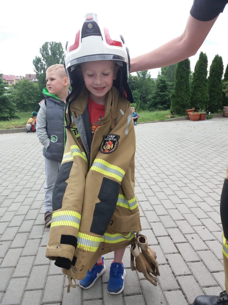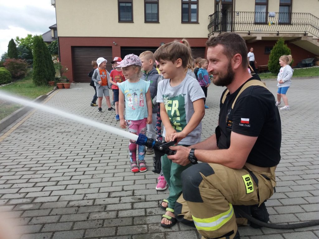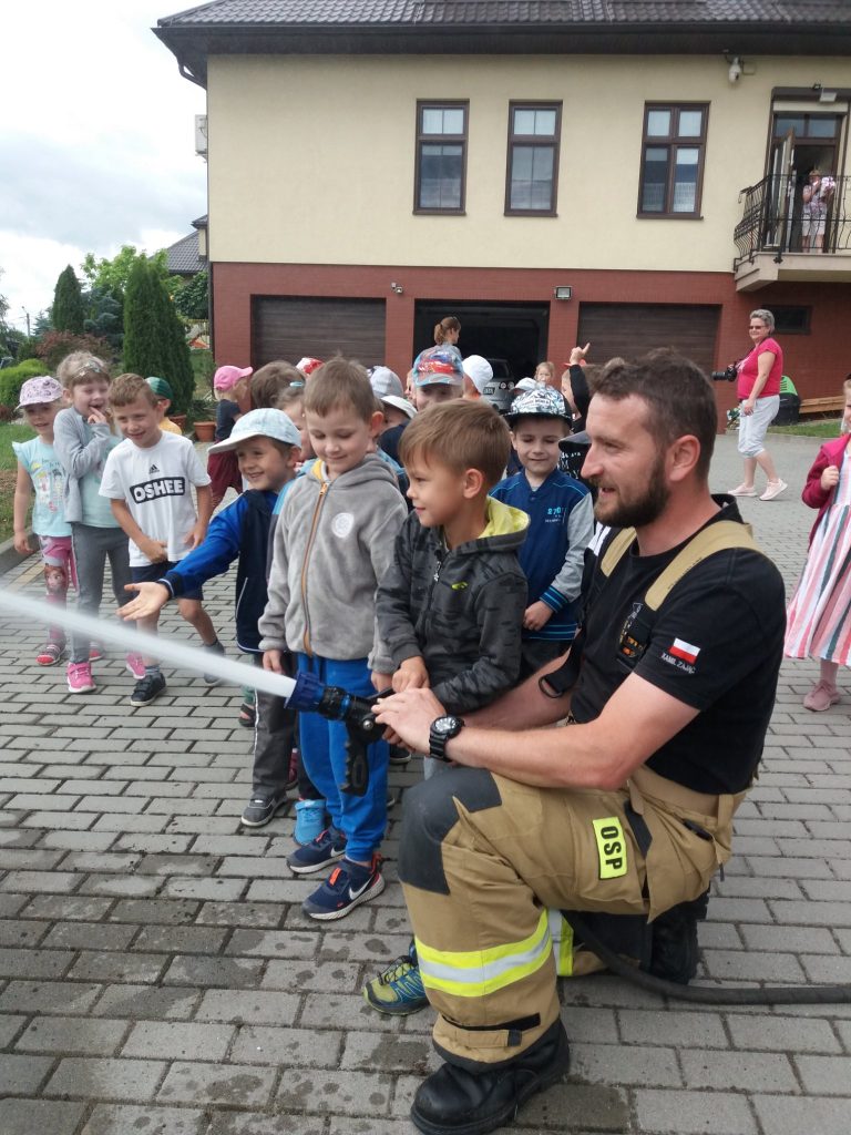 W tym dniu nasze przedszkole odwiedzili Strażacy z Ochotniczej Straży Pożarnej w Kosinie. Dzieci z ogromną radością i entuzjazmem przywitali Pana Kamila i Pana Damiana. Podczas spotkania przedszkolaki dowiedziały się jak wygląda praca strażaków, poznały wyposażenie wozu strażackiego i obejrzały sprzęty i narzędzia wykorzystywane do akcji ratunkowych. Miały okazję zobaczyć i przymierzyć strój strażaka oraz hełm. Zasiadły za kierownicą wozu strażackiego i posłuchały odgłosów jakie wydaje. Starszaki mogły spróbować swoich sił w trzymaniu węża strażackiego i laniu wody.