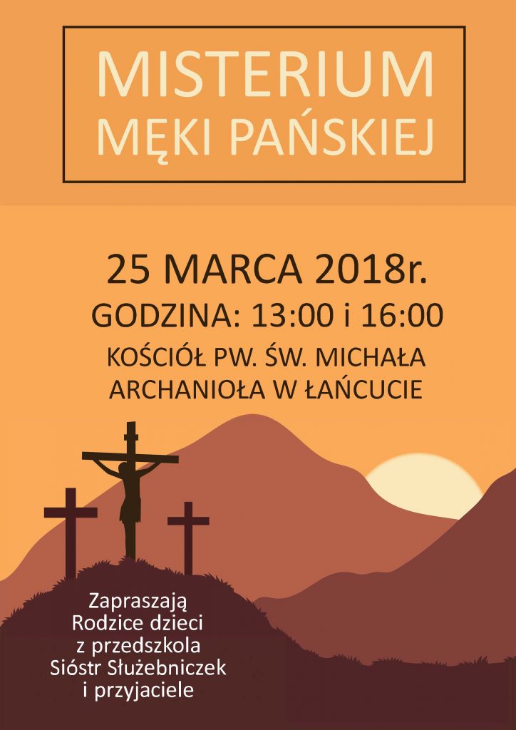 Drodzy Państwo, drodzy rodzice i przyjaciele przedszkola ! Serdecznie zapraszamy na Misterium Męki Pańskiej, które odbędzie się 25 marca 2018r (niedziela) o godzinie 13:00 i 16:00 w kościele pw. św Michała Archanioła w Łańcucie.