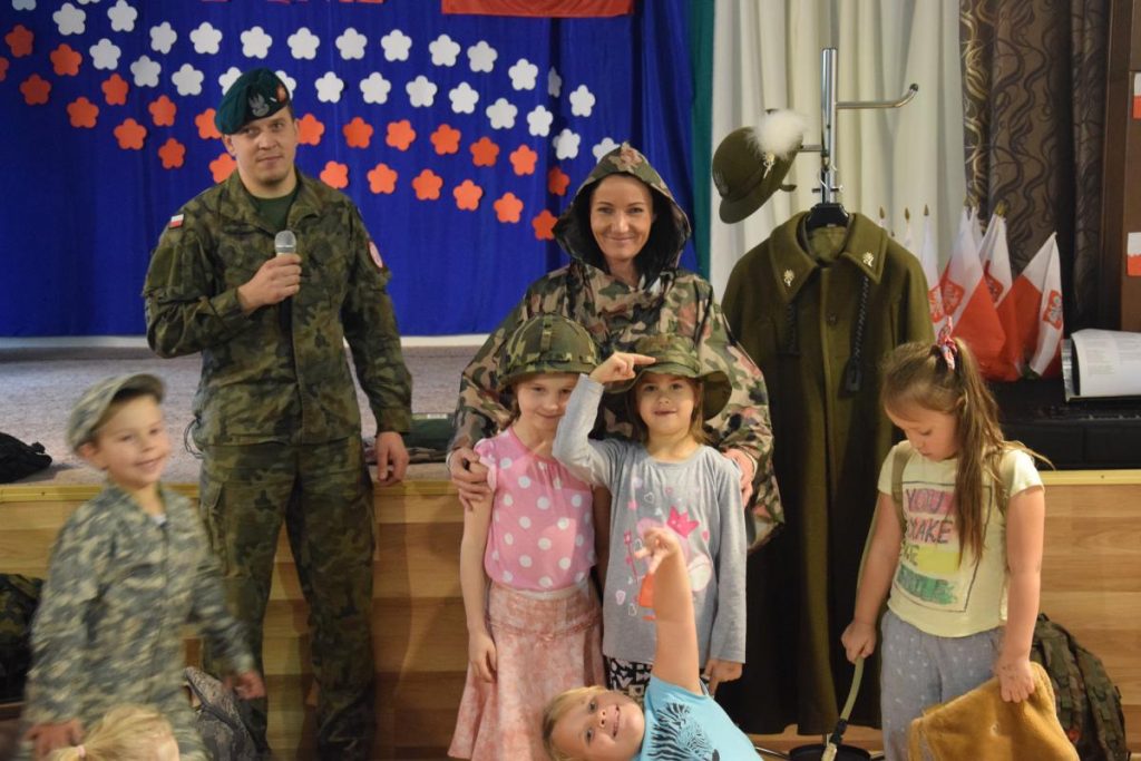 Spotkanie z żołnierzem Do naszego przedszkola zaprosiliśmy niezwykłego gościa, który w pełnym umundurowaniu i z ekwipunkiem opowiedział o swojej pracy. Każdy przedszkolak miał okazje usłyszeć jak trudna i wymagająca poświęceń jest praca naszych żołnierzy. Dlatego naszym obowiązkiem jest ją szanować. Nasz gość opowiedział o specyfice umundurowania godnie z sytuacja w której się znajduje. Rzeczy przywiezione