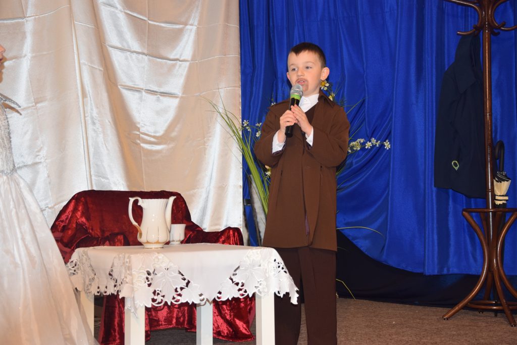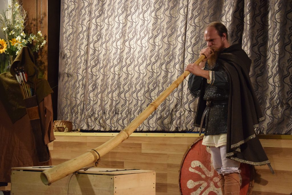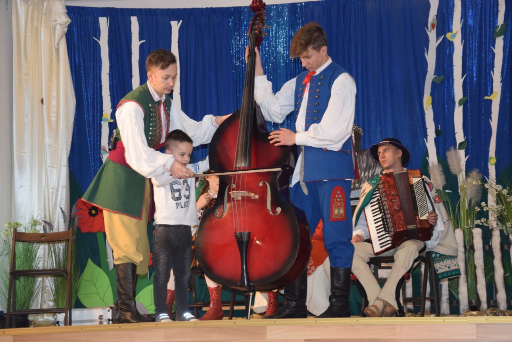 No cóż to była niezwykła lekcja!!! Nasi goście przybyli do nas z osady w Stobiernej i pokazali jak wyglądało życie kiedyś – a było zupełnie inne. Mogliśmy zobaczyć dawne stroje a nawet noszoną wówczas biżuterię. Z opowieści naszych gości  dowiadywaliśmy się o zwyczajach i tradycjach , które kreowały dawną rzeczywistość. Oczywiście chłopców bardzo zainteresowała zbroja,